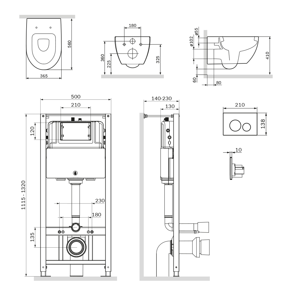 Полностью готовый к установке комплект: система инсталляции с клавишей подвесной унитаз с сиденьем. Не разборная рама из стального профиля выдерживает нагрузку до 400 кг. Полностью изолированный бачок с качественной двухрежимной смывной арматурой - комфортное использование благодаря низкому уровню шума - менее 20 Дб. Укомплектован пневматической клавишей в цвете глянцевый хром.