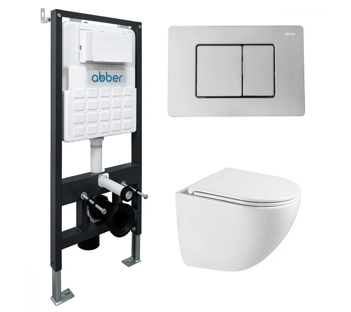 Комплект подвесной унитаз ABBER Bequem AC1131TC белый, с закрытым дном с инсталляцией AC0105 и кнопкой AC0120 хром глянцевый