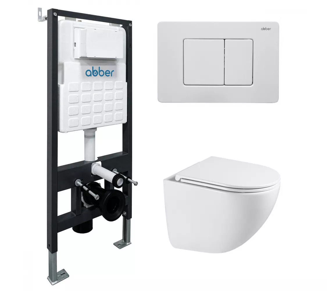 Комплект подвесной унитаз ABBER Bequem AC1131TC белый, с закрытым дном с инсталляцией AC0105 и кнопкой AC0120MW белая матовая