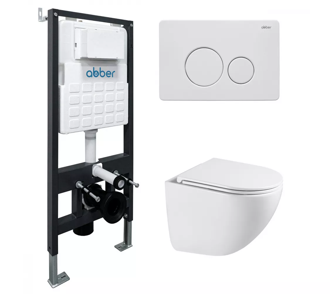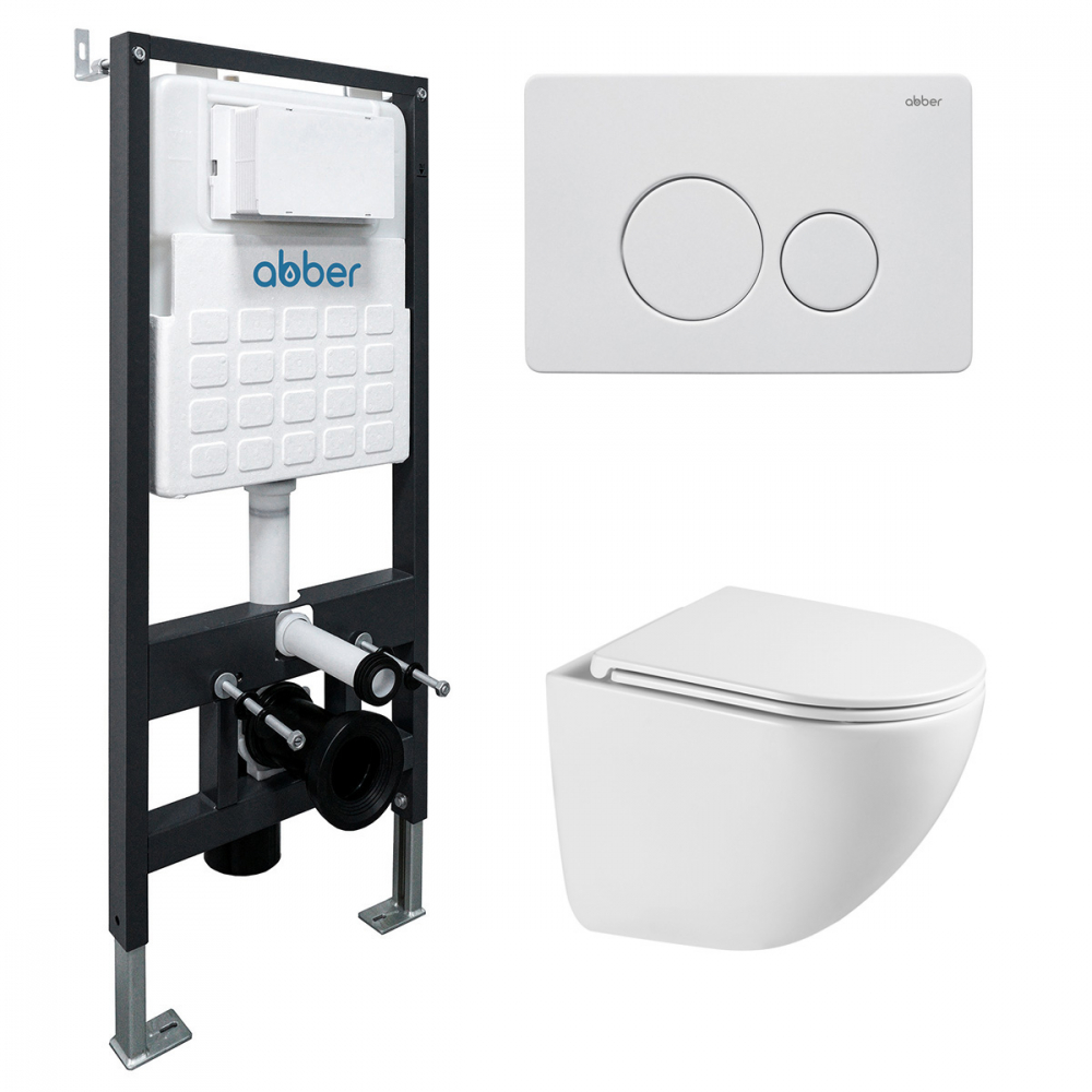 Комплект подвесной унитаз ABBER Bequem AC1131TC белый, с закрытым дном с инсталляцией AC0105 и кнопкой AC0121MW белая матовая