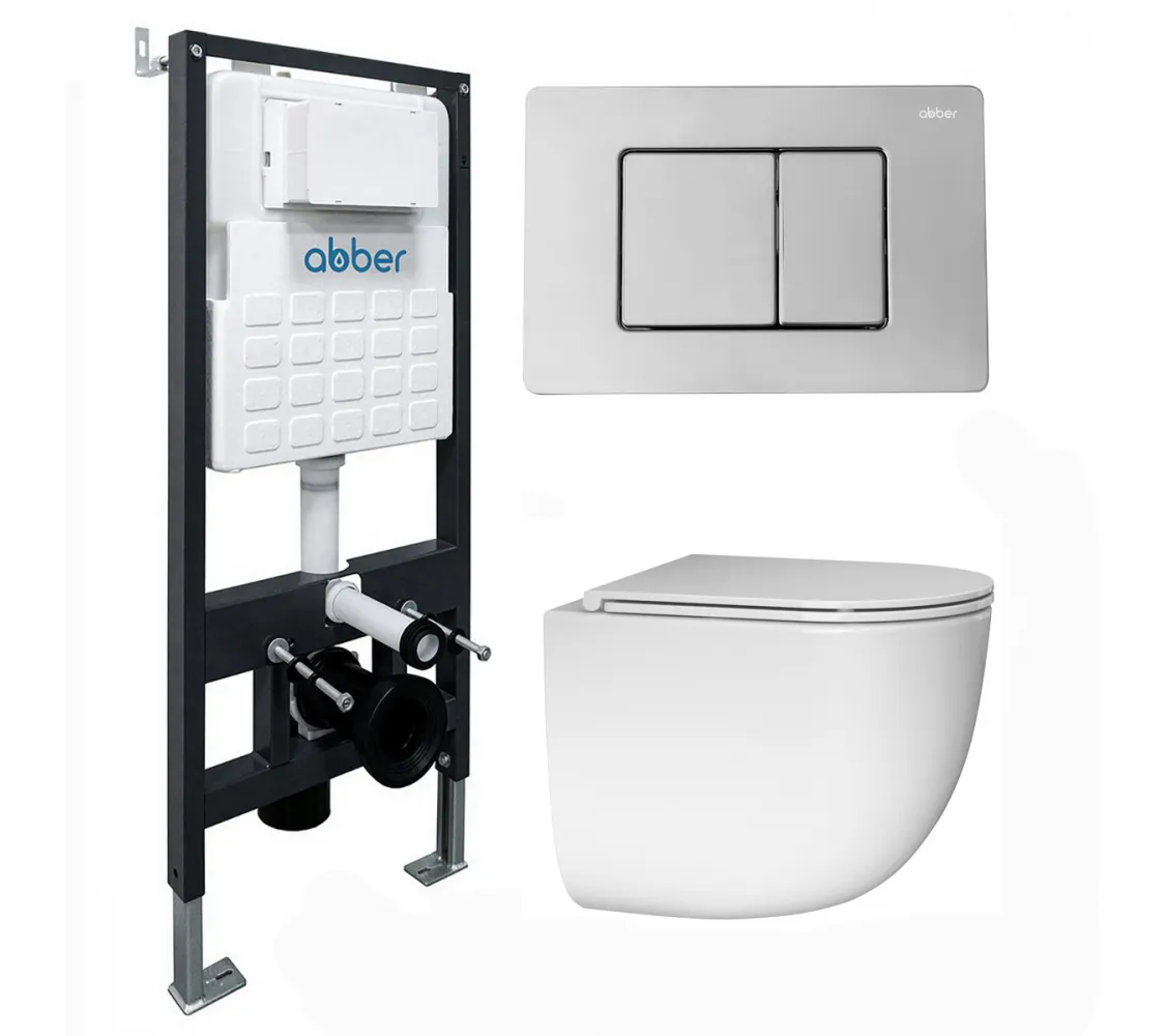 Комплект подвесной унитаз ABBER Bequem AC1132TC белый, с закрытым дном с инсталляцией AC0105 и кнопкой AC0120 хром глянцевый