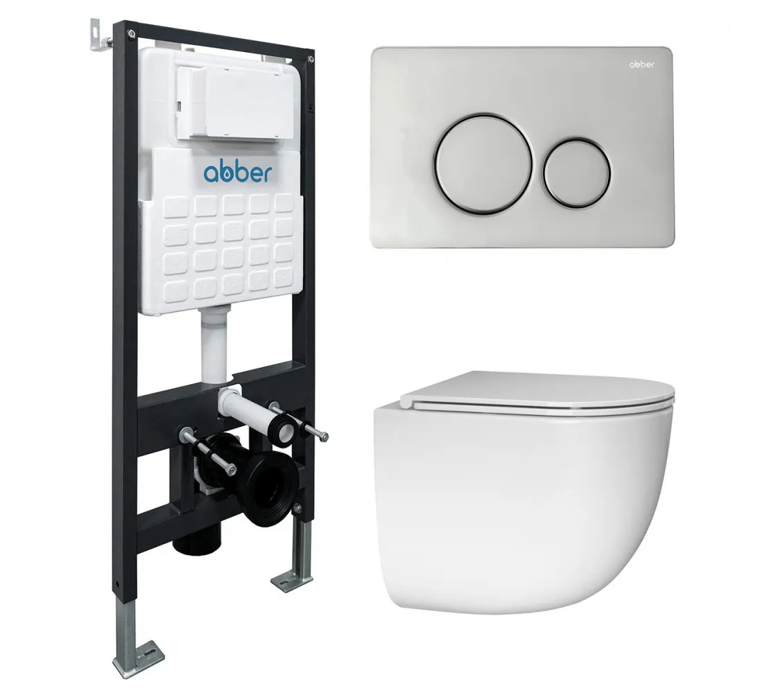 Комплект подвесной унитаз ABBER Bequem AC1132TC белый, с закрытым дном с инсталляцией AC0105 и кнопкой AC0121 хром глянцевый