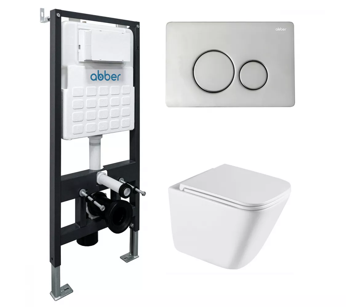 Комплект подвесной унитаз ABBER Rechteck AC1219TC белый, с закрытым дном с инсталляцией AC0105 и кнопкой AC0121 хром глянцевый