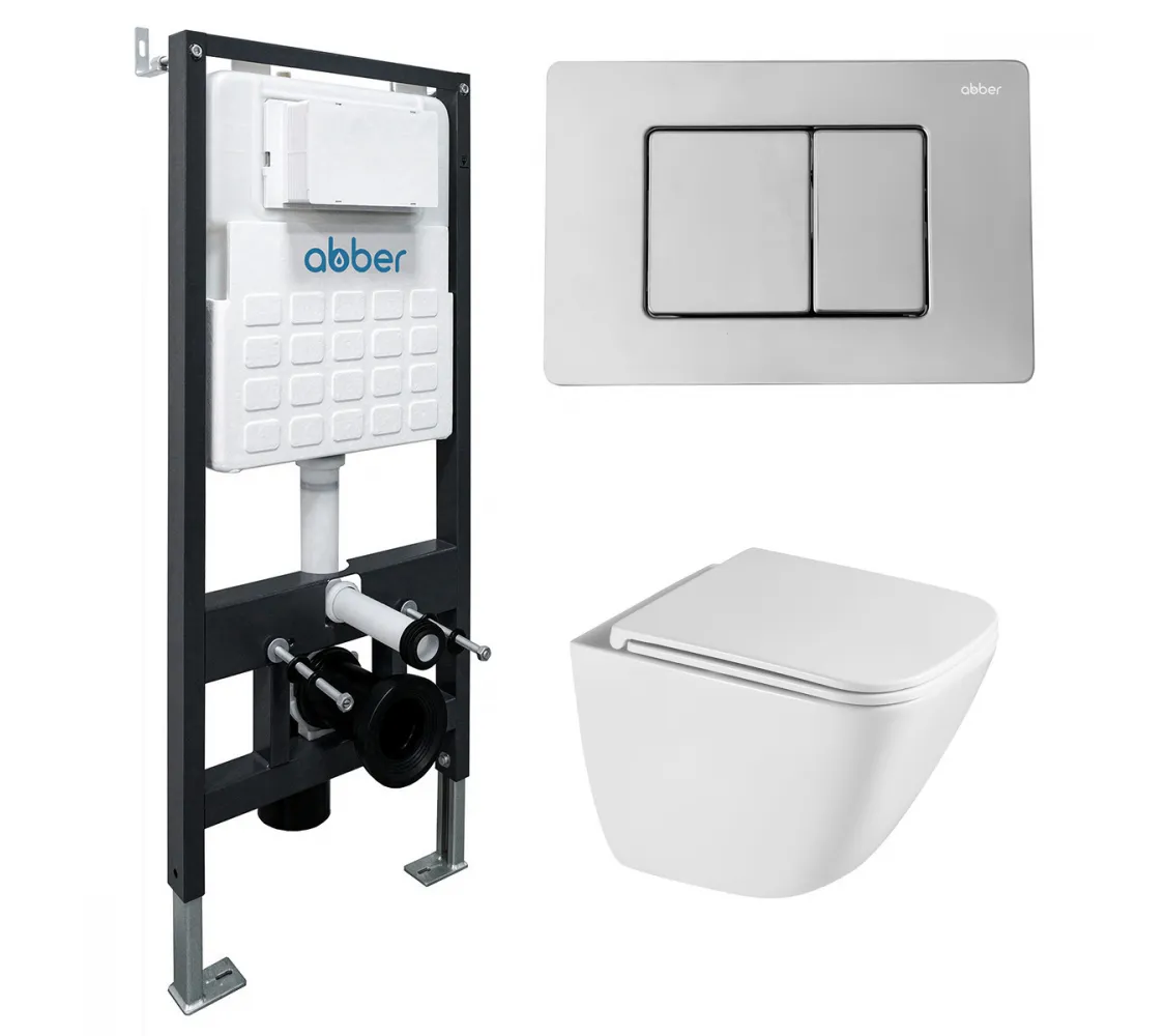 Комплект подвесной унитаз ABBER Rechteck AC1220TC белый, с закрытым дном с инсталляцией AC0105 и кнопкой AC0120 хром глянцевый