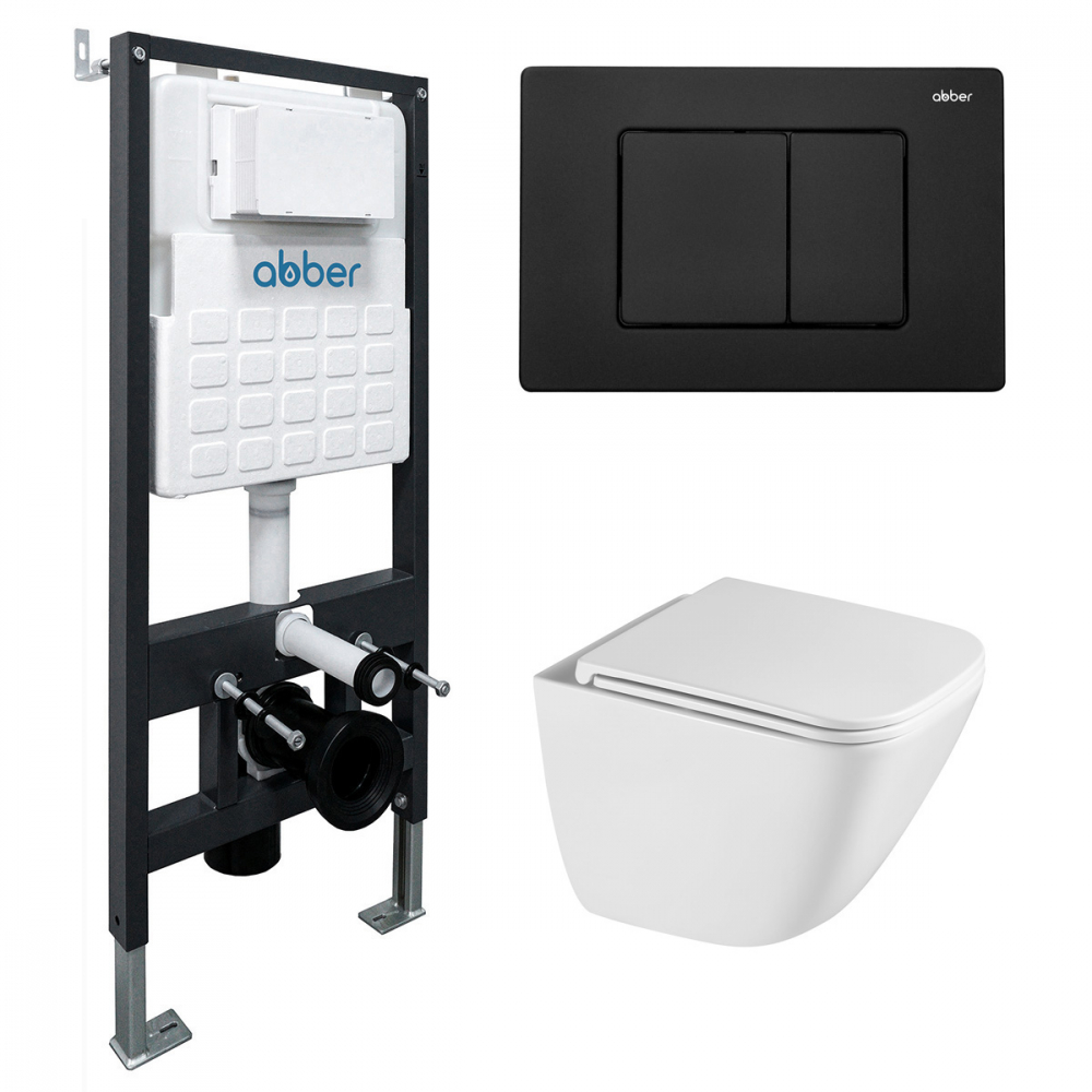 Комплект подвесной унитаз ABBER Rechteck AC1220TC белый, с закрытым дном с инсталляцией AC0105 и кнопкой AC0120MB черный матовый