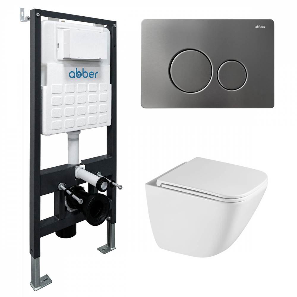 Комплект подвесной унитаз ABBER Rechteck AC1220TC белый, с закрытым дном с инсталляцией AC0105 и кнопкой AC0121NG никель