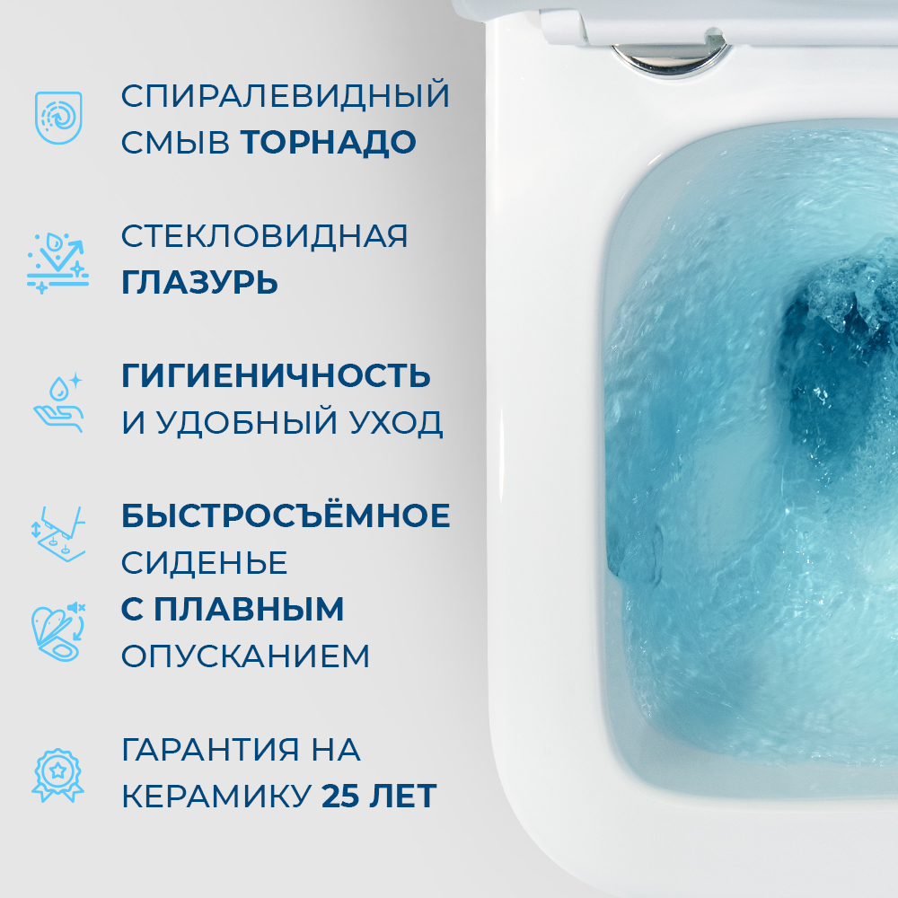 TORNADO - самая передовая и технологичная система смыва, благодаря мощному спиралевидному потоку, который образуется при выбросе воды из отверстия, размещенного в верхней части чаши унитаза. Это создает эффективный водоворот, который полностью омывает всю внутреннюю поверхность унитаза. Система смыва TORNADO не только гарантирует чистоту, но и гармонично соединяет дизайн с функциональностью.Смыв происходит с минимальным уровнем шума, а направление потока и конструкция чаши полностью исключают выплескивание воды. Эти особенности создают благоприятные и комфортные условия для эксплуатации.Унитазы с системой смыва TORNADO помогают экономить воду и Ваши средства. За счет продуманной конструкции, объем смыва устанавливается на минимальные значения, что означает меньшее потребление воды без ущерба для качества смыва.•Продукция произведена по международным стандартам EN•Эффективный спиралевидный смыв•Низкий уровень шума при смыве•Конструкция чаши и направление потока смыва полностью исключают выплескивание воды•Стекловидная глазурь•Сиденье в комплекте с унитазом•Быстросъёмная крышка-сиденье обеспечивает легкий и удобный уход, оснащена механизмом плавного опускания•Скрытая крепежная система•Легкость сборки и монтажа•Гигиеничность и удобный уход•Гарантия: 25 лет на керамику, на крышку-сиденье 1 год