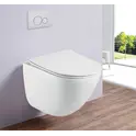 БЕЗОБОДКОВЫЙ подвесной унитаз. Бортик по периметру чаши. Горизонтальный выпуск ("P-Trap" 180 мм). Цвет: белый. Сиденье: ультратонкое, быстросъёмное, дюропласт с металлическим крепежом и микролифтом (механизм "Soft Close").