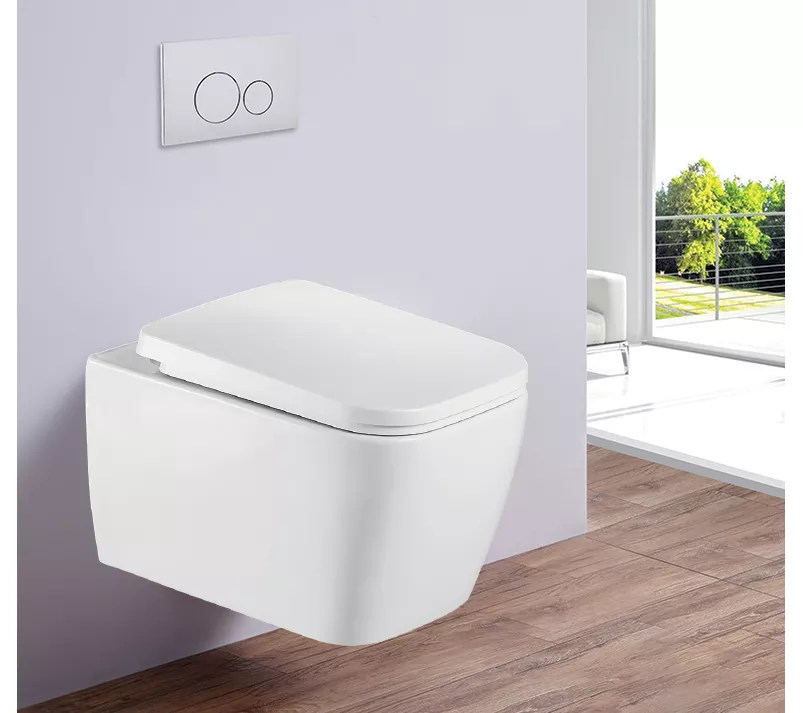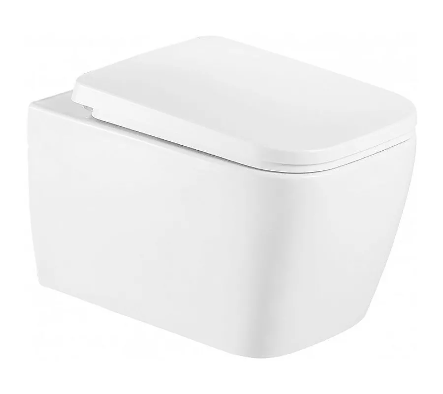 БЕЗОБОДКОВЫЙ подвесной унитаз. Бортик по периметру чаши. Горизонтальный выпуск ("P-Trap" 180 мм). Цвет: белый. Сиденье: ультратонкое, быстросъёмное, дюропласт с металлическим крепежом и микролифтом (механизм "Soft Close").