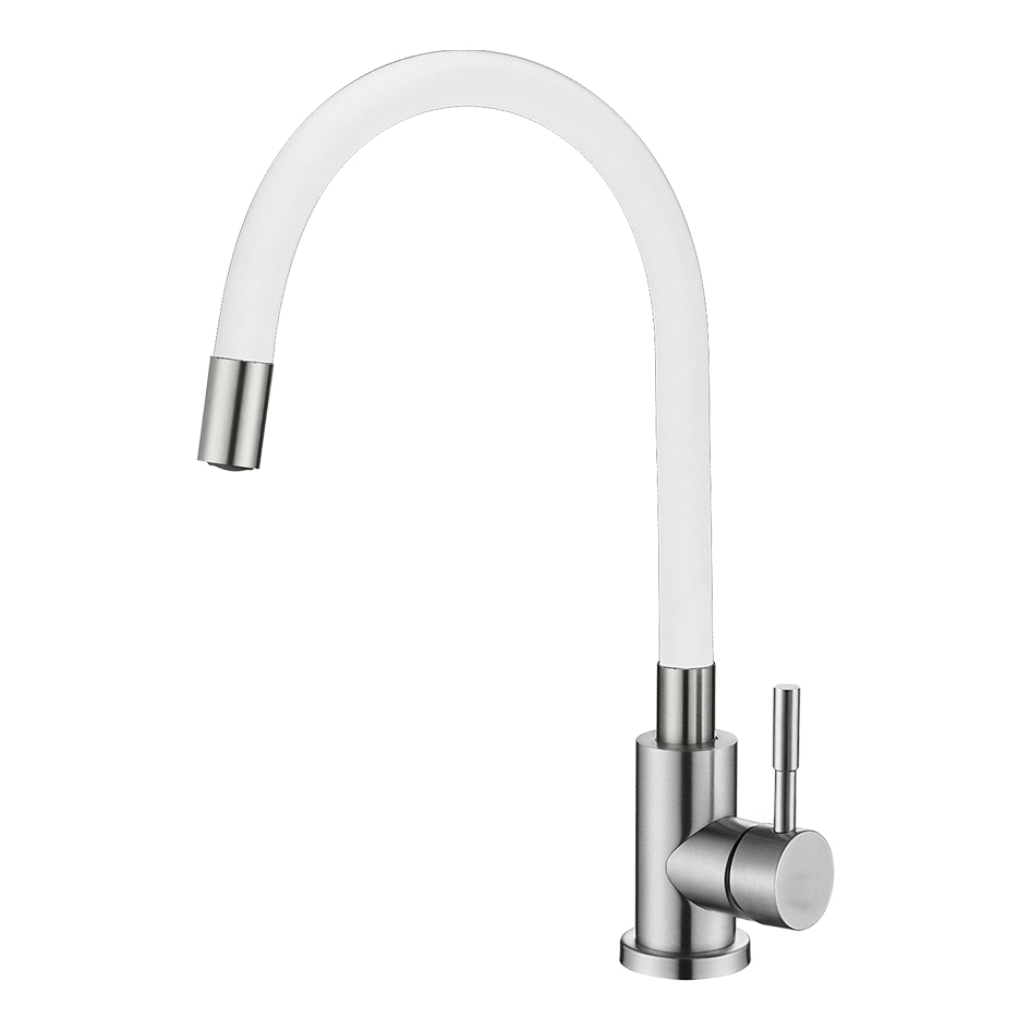 Смеситель д/кухни MELANA ELASTICO-610401W нерж.сталь, однорычажный,гибкий излив,сатин+белый