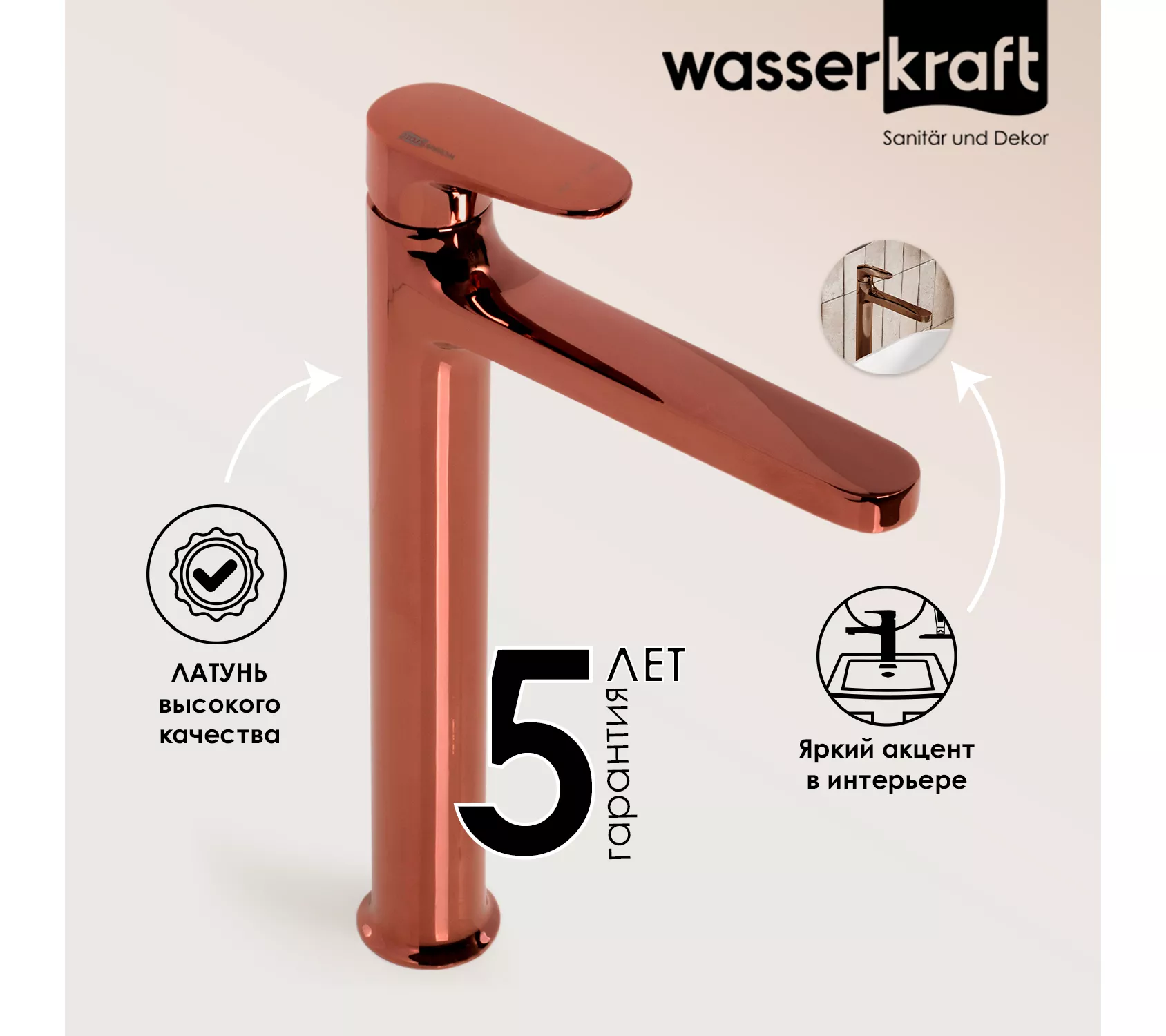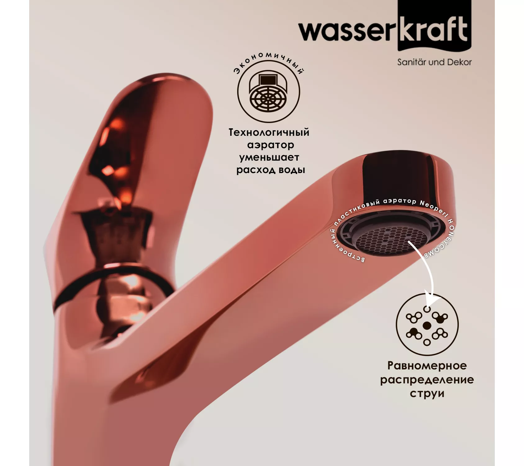 PVD-покрытие "розовое золото".Покрытие помогает защитить поверхность изделий от воздействия внешней среды. Для ухода за изделиями WasserKRAFT достаточно теплой воды, мыльного раствора и сухого полотенца. Технология нанесения.Очищенное заранее изделие, помещается в вакуум, где с помощью конденсации пара наносится покрытие. При этом, конденсат пара содержит частицы необходимых металлов для получения нужного цвета. Далее наносится лак и изделие отправляется сушиться.