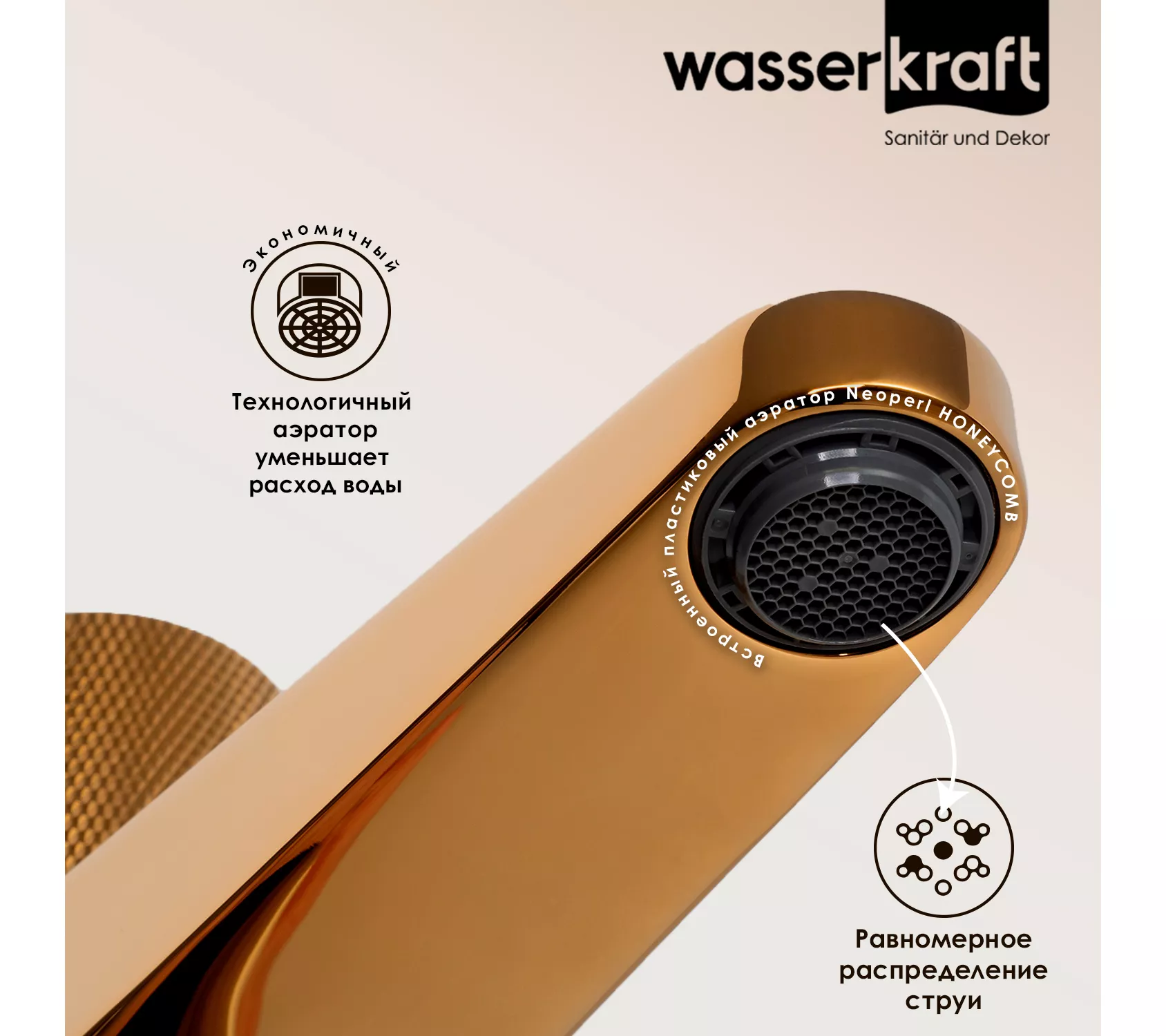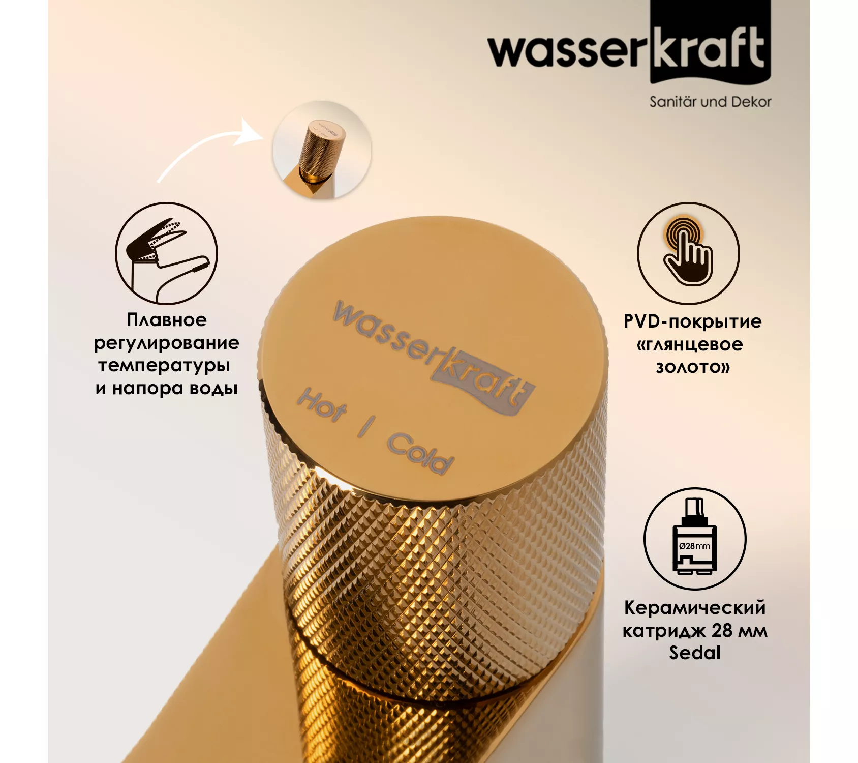 PVD-покрытие «глянцевое золото».Покрытие помогает защитить поверхность изделий от воздействия внешней среды. Для ухода за изделиями WasserKRAFT достаточно теплой воды, мыльного раствора и сухого полотенца. Технология нанесения.Очищенное заранее изделие, помещается в вакуум, где с помощью конденсации пара наносится покрытие. При этом, конденсат пара содержит частицы необходимых металлов для получения нужного цвета. Далее наносится лак и изделие отправляется сушиться.