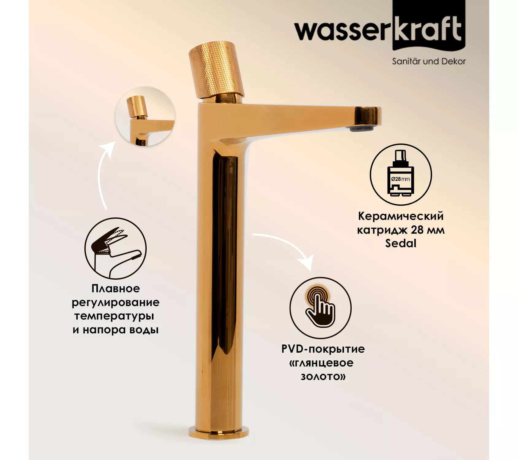 PVD-покрытие «глянцевое золото».Покрытие помогает защитить поверхность изделий от воздействия внешней среды. Для ухода за изделиями WasserKRAFT достаточно теплой воды, мыльного раствора и сухого полотенца. Технология нанесения.Очищенное заранее изделие, помещается в вакуум, где с помощью конденсации пара наносится покрытие. При этом, конденсат пара содержит частицы необходимых металлов для получения нужного цвета. Далее наносится лак и изделие отправляется сушиться.
