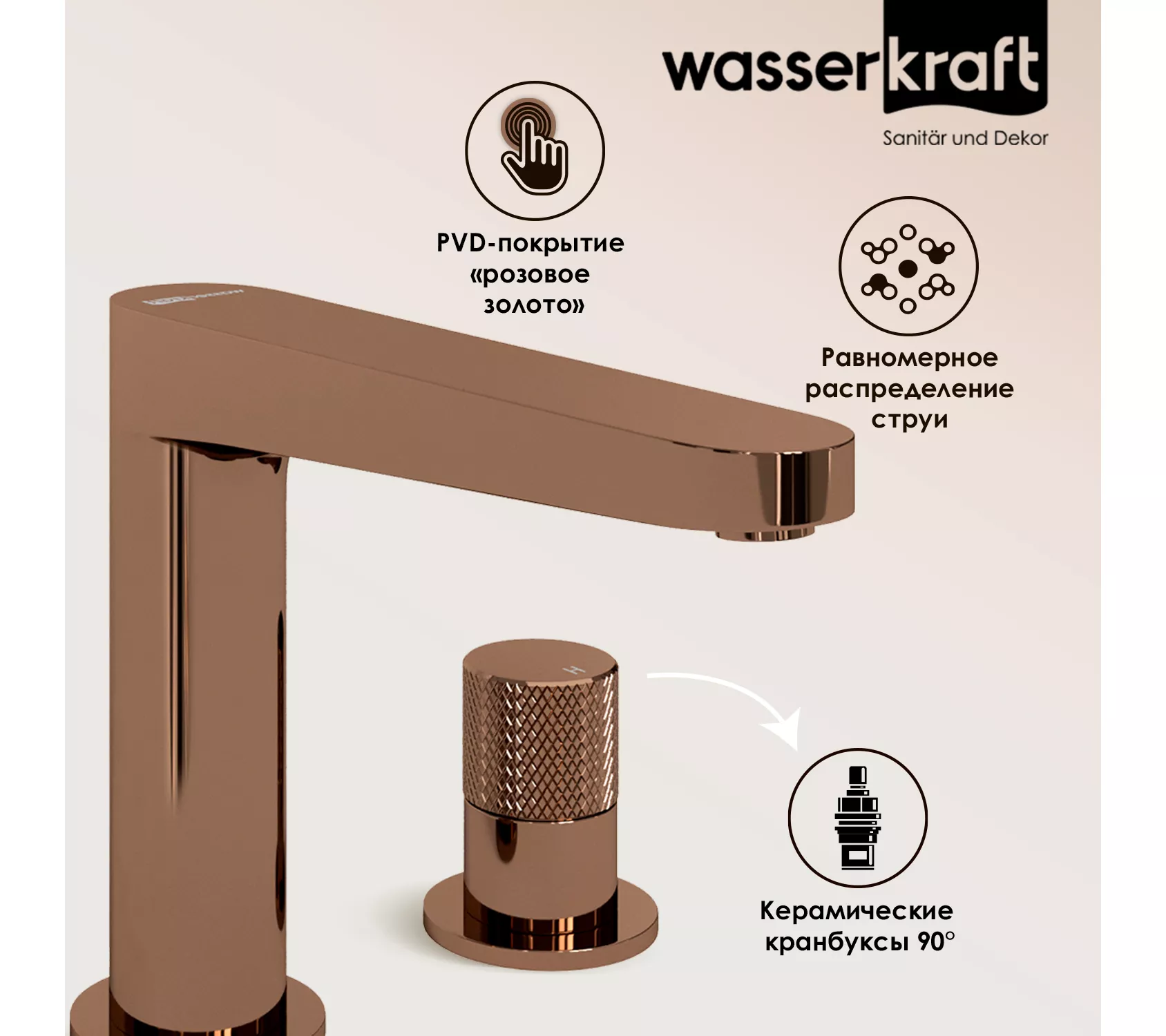 PVD-покрытие «розовое золото».Покрытие помогает защитить поверхность изделий от воздействия внешней среды. Для ухода за изделиями WasserKRAFT достаточно теплой воды, мыльного раствора и сухого полотенца. Технология нанесения.Очищенное заранее изделие, помещается в вакуум, где с помощью конденсации пара наносится покрытие. При этом, конденсат пара содержит частицы необходимых металлов для получения нужного цвета. Далее наносится лак и изделие отправляется сушиться.