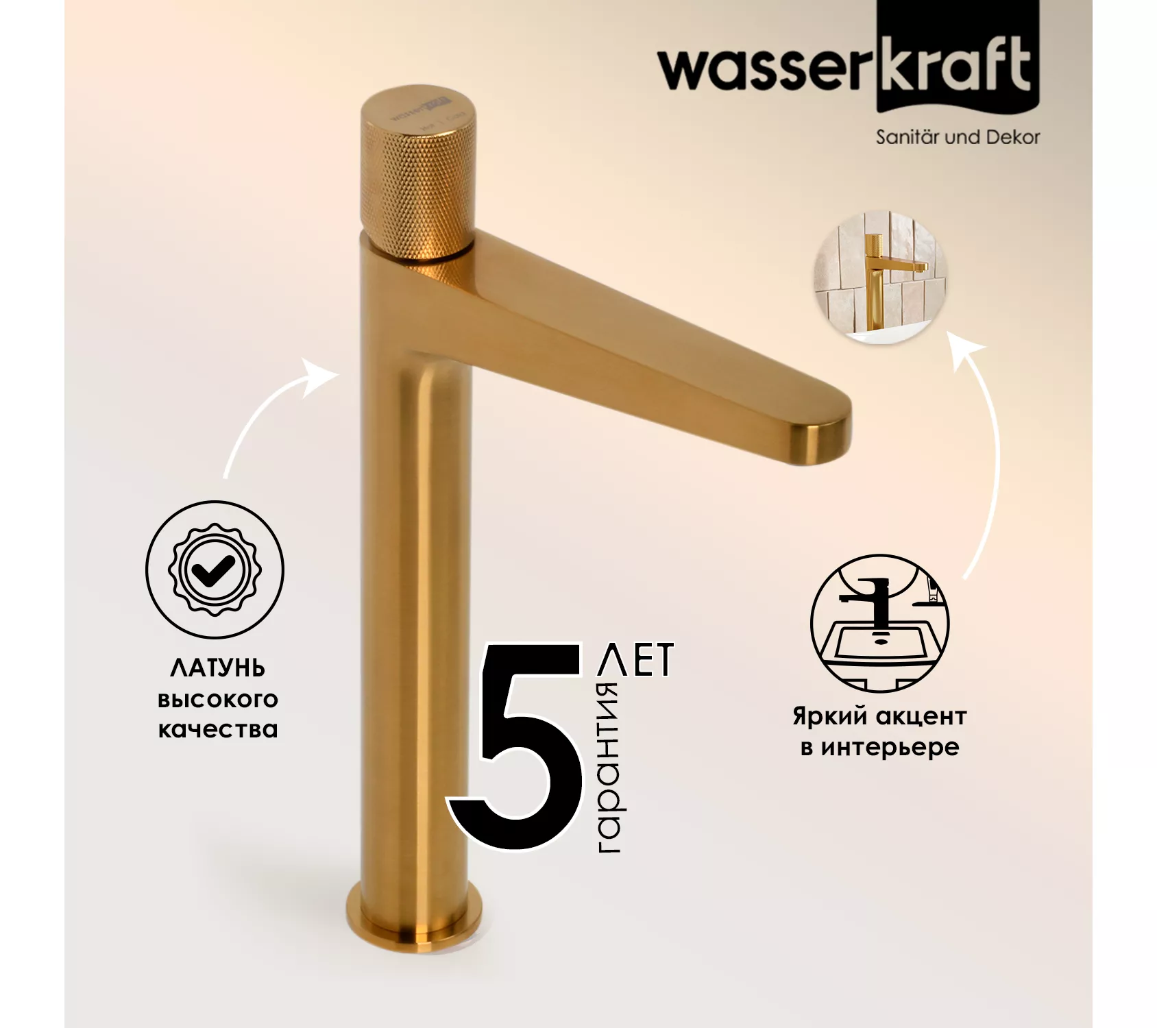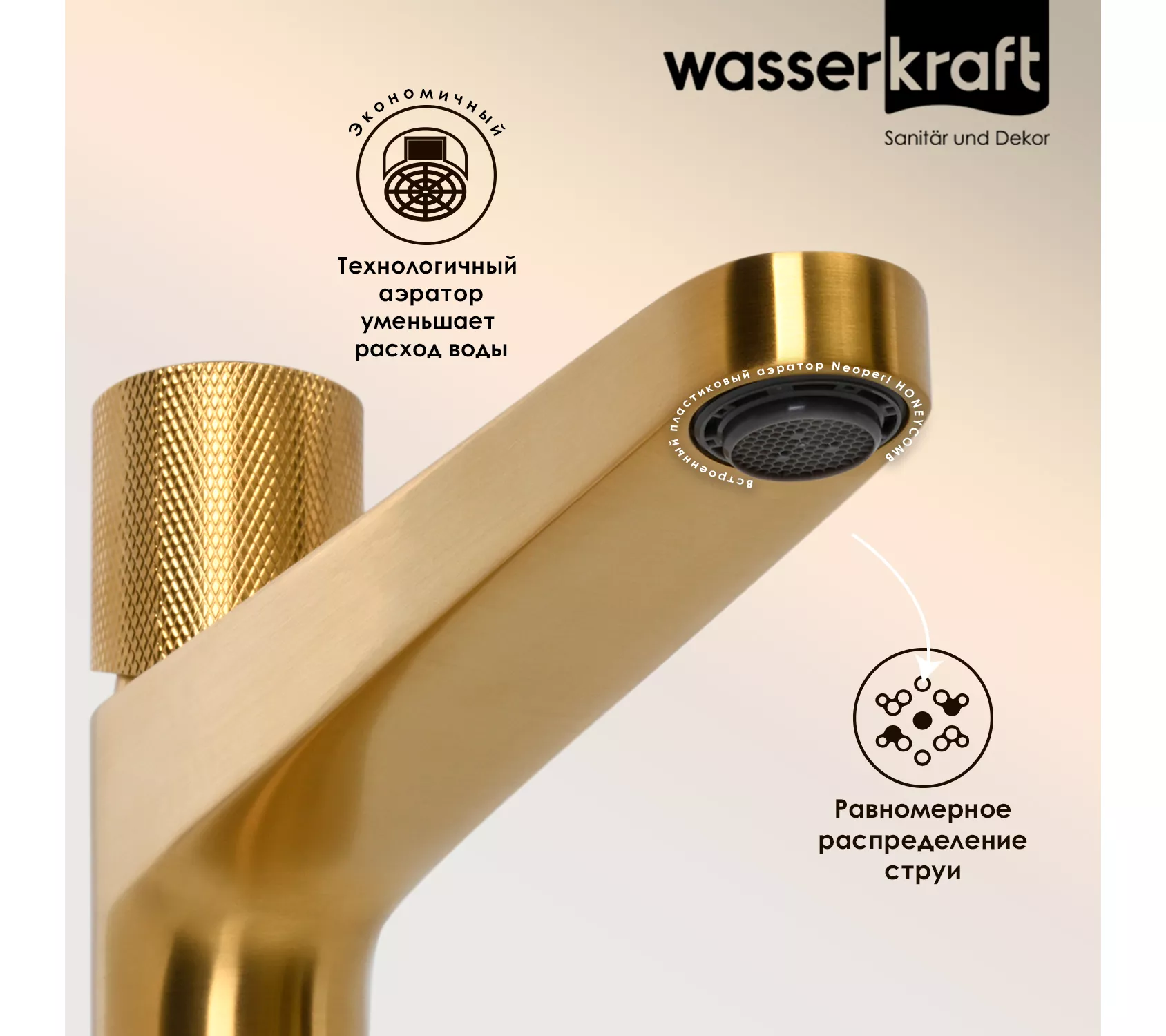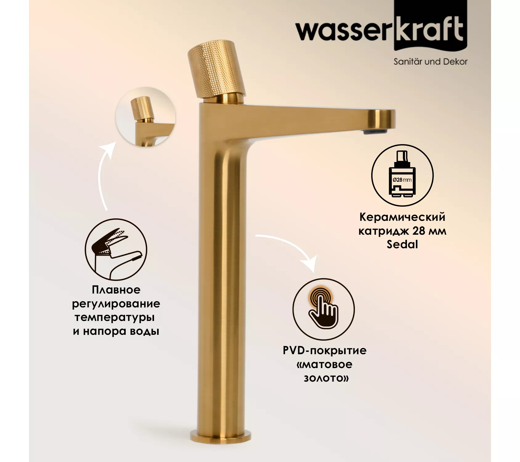PVD-покрытие «матовое золото».Покрытие помогает защитить поверхность изделий от воздействия внешней среды. Для ухода за изделиями WasserKRAFT достаточно теплой воды, мыльного раствора и сухого полотенца. Технология нанесения.Очищенное заранее изделие, помещается в вакуум, где с помощью конденсации пара наносится покрытие. При этом, конденсат пара содержит частицы необходимых металлов для получения нужного цвета. Далее наносится лак и изделие отправляется сушиться.