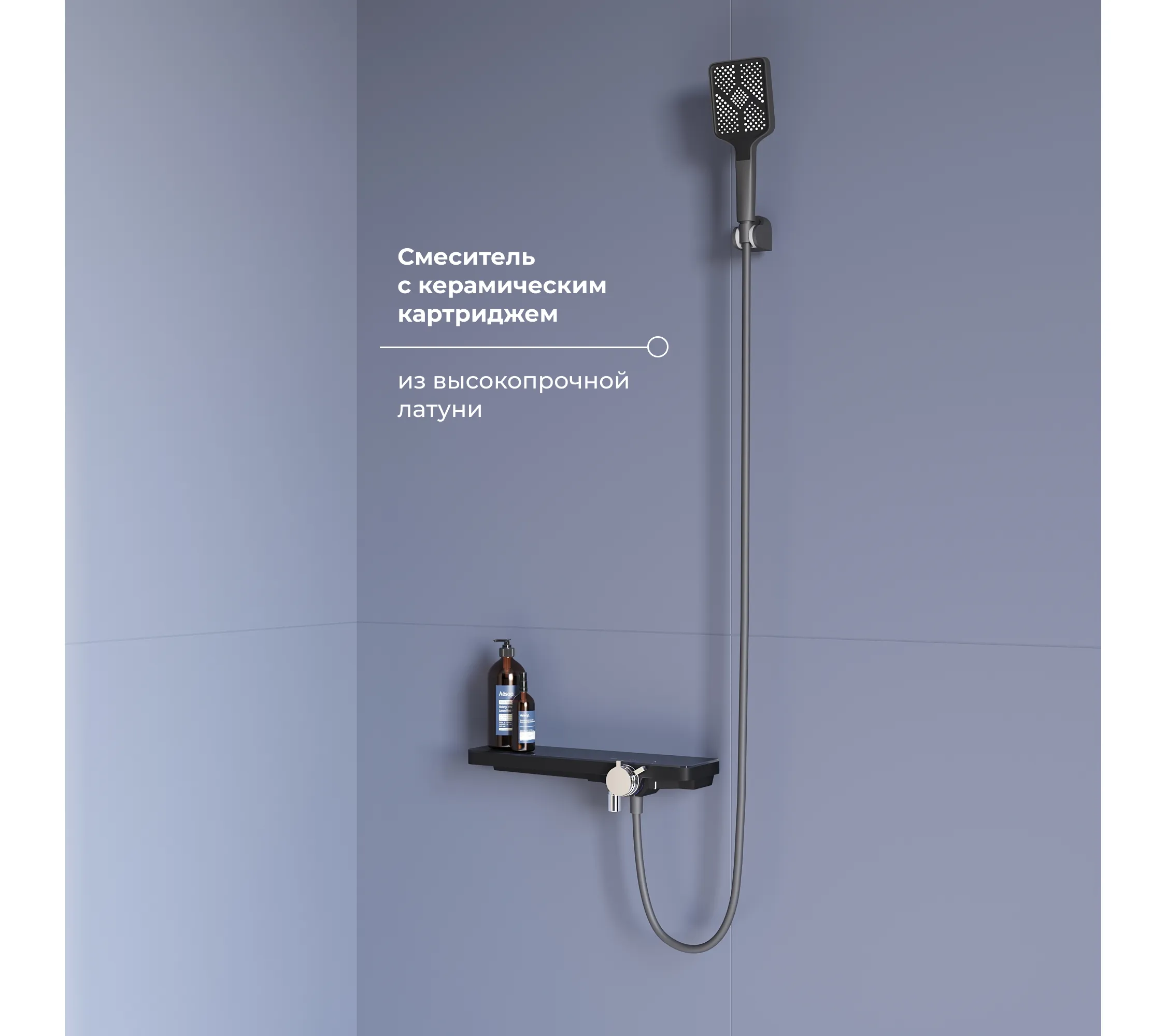 Материал внутренней части корпуса состоит из латуни, а покрытие корпуса состоит из АБС-пластика,шланг для душа из АБС-пластика, длиной 1,5 м, аэратор насадка на кран состоит из латуни и АБС-пластика