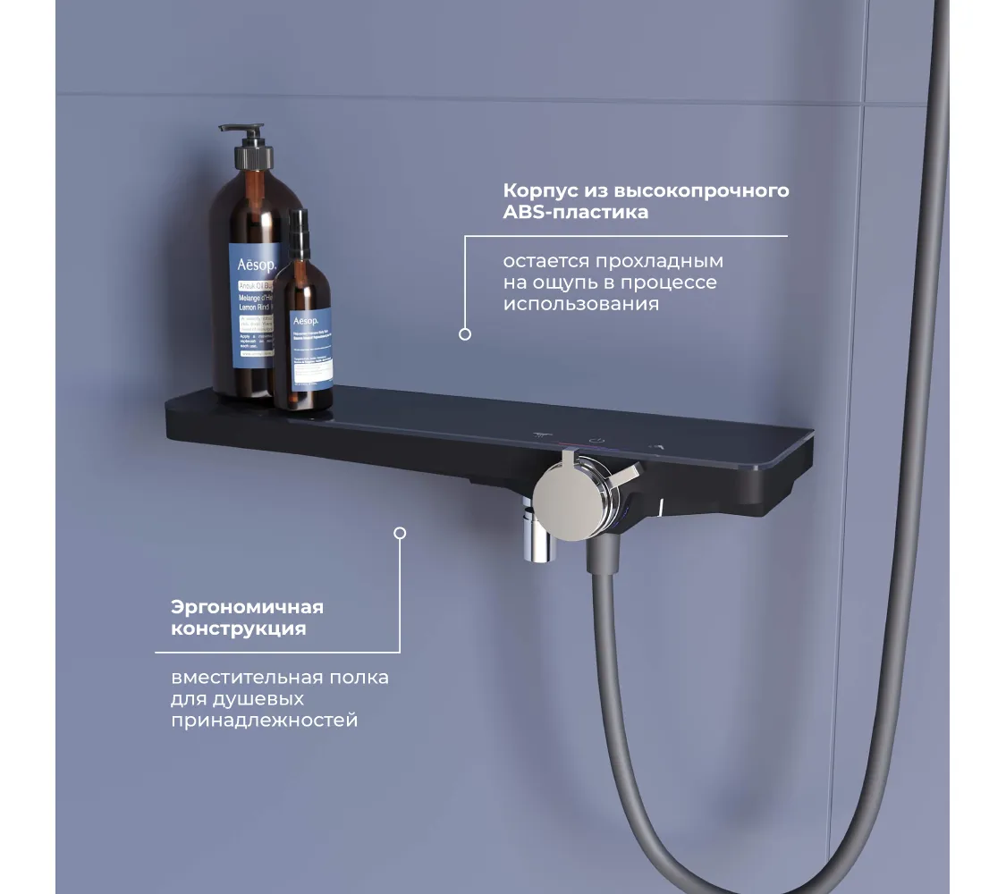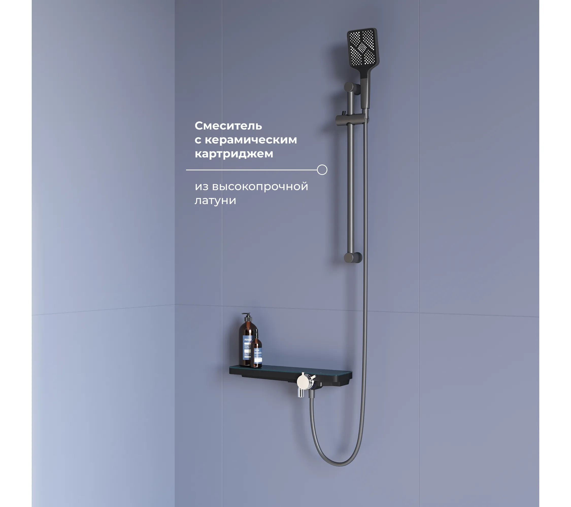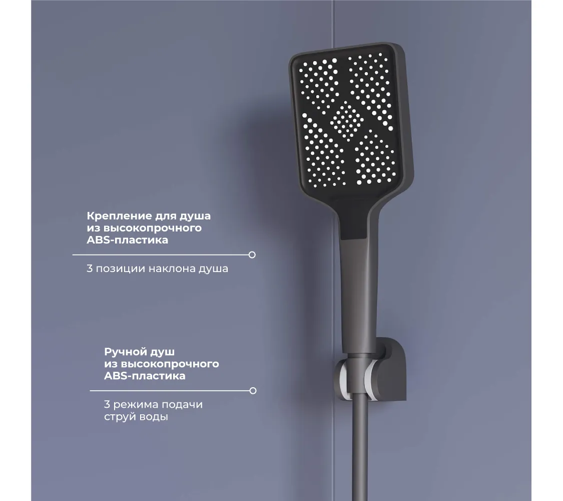 Материал внутренней части корпуса состоит из латуни, а покрытие корпуса состоит из АБС-пластика,шланг для душа из АБС-пластика, длиной 1,5 м, аэратор насадка на кран состоит из латуни и АБС-пластика