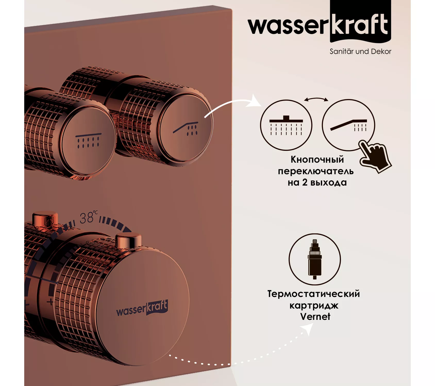 PVD-покрытие "розовое золото".Покрытие помогает защитить поверхность изделий от воздействия внешней среды. Для ухода за изделиями WasserKRAFT достаточно теплой воды, мыльного раствора и сухого полотенца. Технология нанесения.Очищенное заранее изделие, помещается в вакуум, где с помощью конденсации пара наносится покрытие. При этом, конденсат пара содержит частицы необходимых металлов для получения нужного цвета. Далее наносится лак и изделие отправляется сушиться.