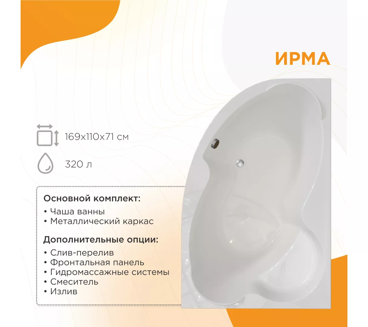 Акриловая ванна "Ирма" – хит продаж! Двусторонняя угловая ванна с удобным сиденьем. Она обладает своим особым стилем и характером, поэтому так вам полюбилась.