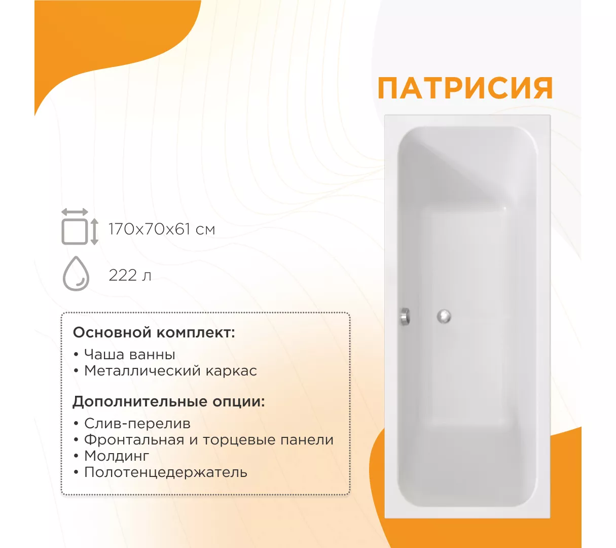 Комплектация : ванна, каркас с ножками, слив-перелив автомат С СЕТОЧКОЙ (с сифоном) Хром , фронтальная панель