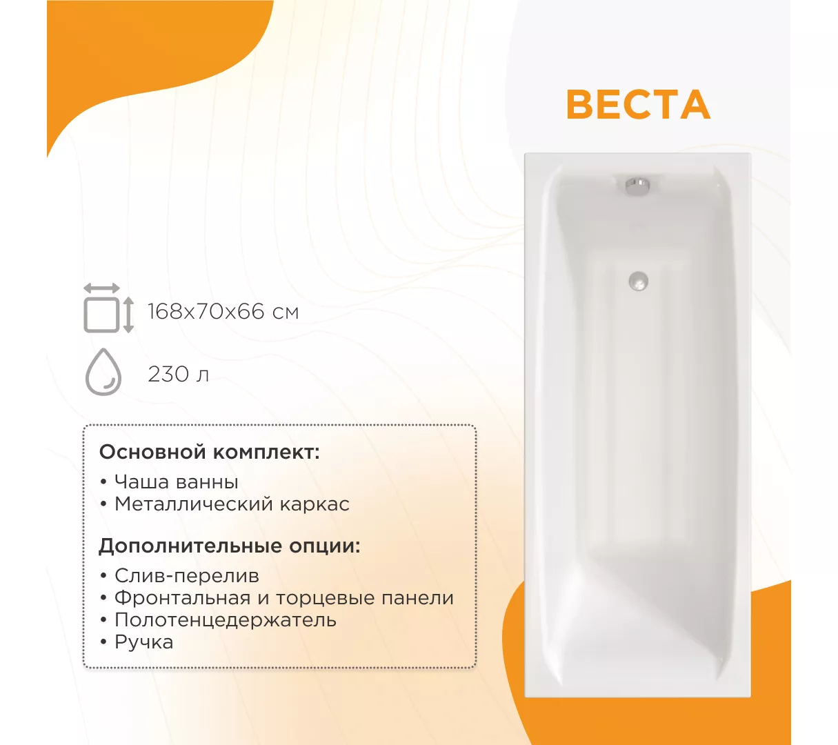 Прямоугольная ванна "Веста" подходит всем, кто выбирает минимализм и практичность. На эту модель обязательно обратят внимание те, для кого важно, чтобы ванна сочеталась с любой тумбой и раковиной и не спорила с другими предметами интерьера. За счет высоты до перелива 42 см обеспечивает хороший уровень погружения и полное расслабление. Ванна "Веста" - отличный вариант для тех, кто хочет купить акриловую прямоугольную ванну недорого.