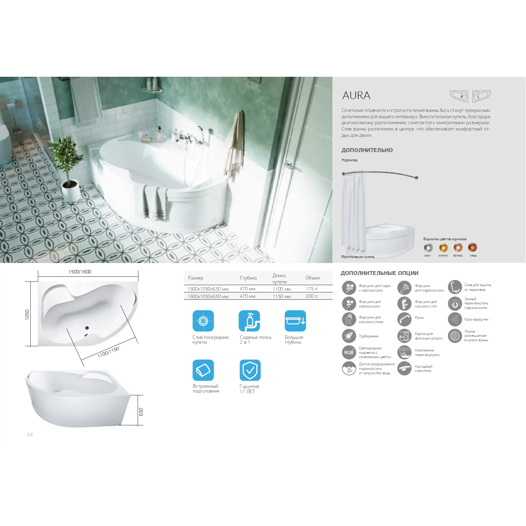 Акриловая ванна Aura отличается большим внутренним объемом и смещенным к середине сливом-переливом. Благодаря этому акриловая ванна Аура обеспечивает достаточно пространства для комфортного отдыха даже вдвоем. Цена модели полностью оправдана эстетикой и практичной формой вместе с удобным сиденьем и подголовником. Выполняться модель может в правом или левом зеркальном виде на выбор