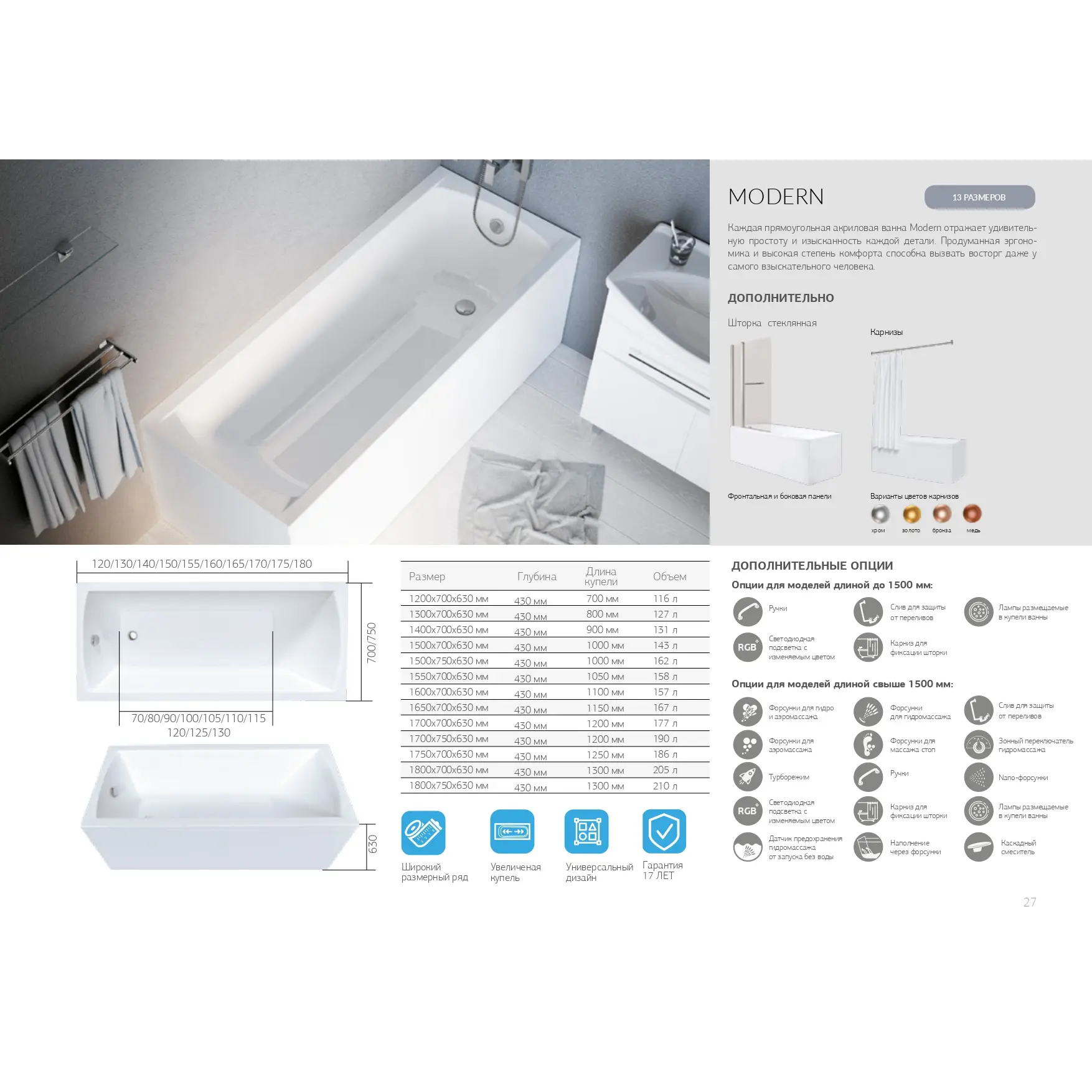 - Каждая прямоугольная акриловая ванна из серии Modern отражает удивительную простоту и изысканность каждой детали. Продуманная эргономика и высокая степень комфорта способна вызвать восторг даже у самого взыскательного человека, привыкшего жить в шикарных условиях. Классический акриловых дизайн ванн серии Модерн позволяет им великолепно вписываться в любой интерьер ванной комнаты.