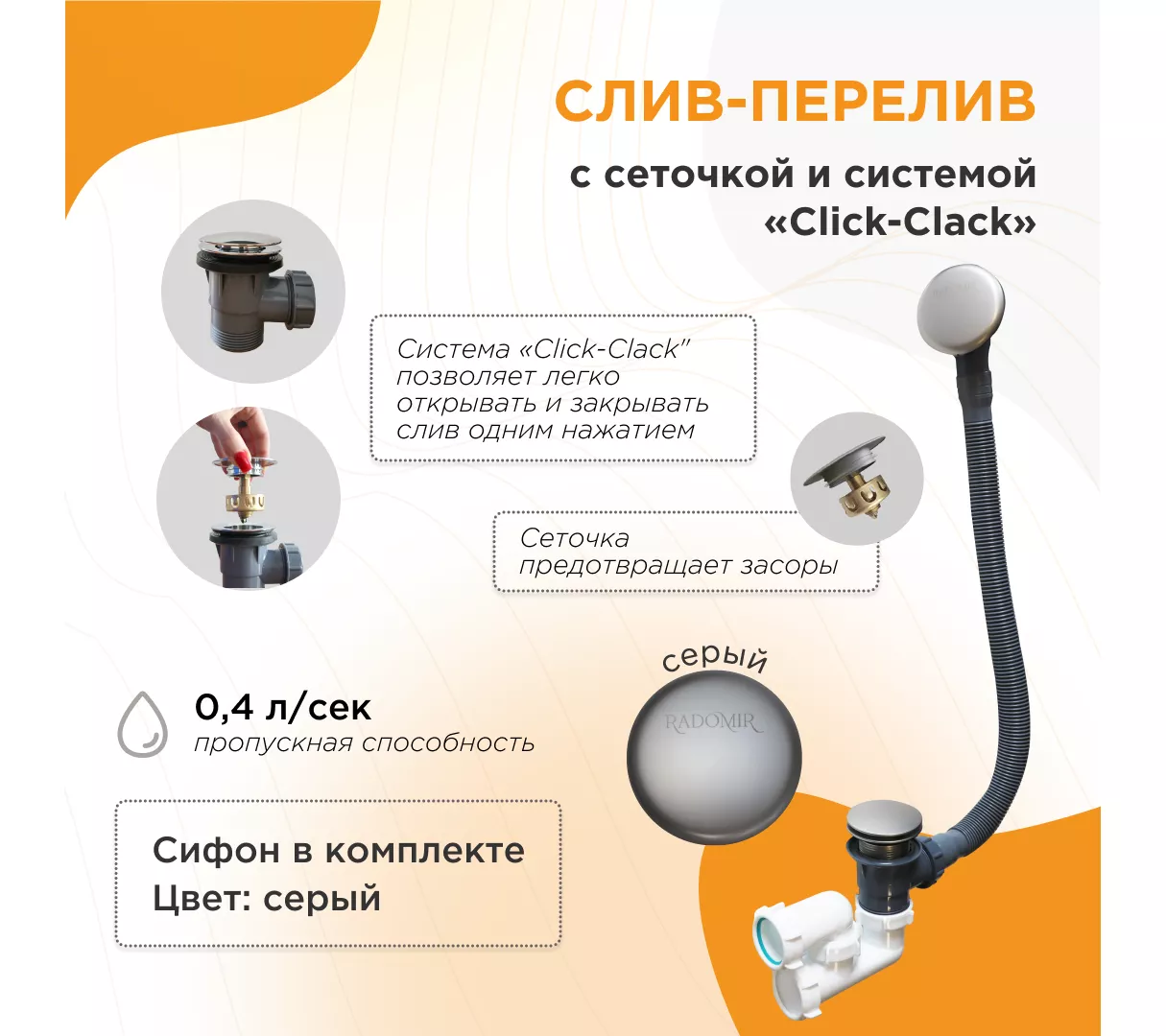 Слив-перелив с сеточкой и системой «Click-Clack»— это современное и функциональное решение для ванной комнаты. Сеточка слива защищает канализацию от засоров.