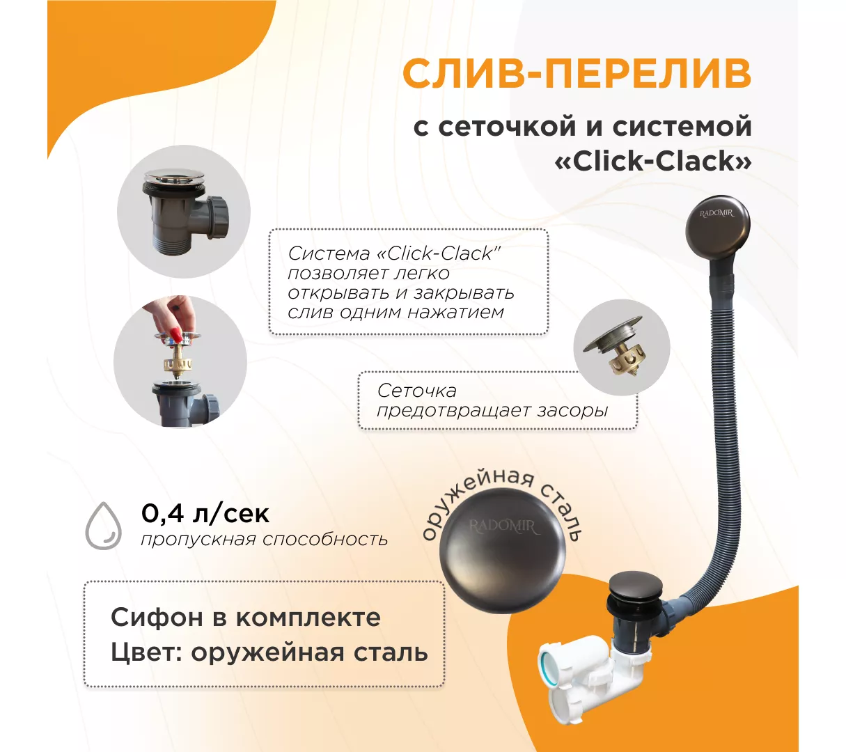 Слив-перелив с сеточкой и системой «Click-Clack»— это современное и функциональное решение для ванной комнаты. Сеточка слива защищает канализацию от засоров.