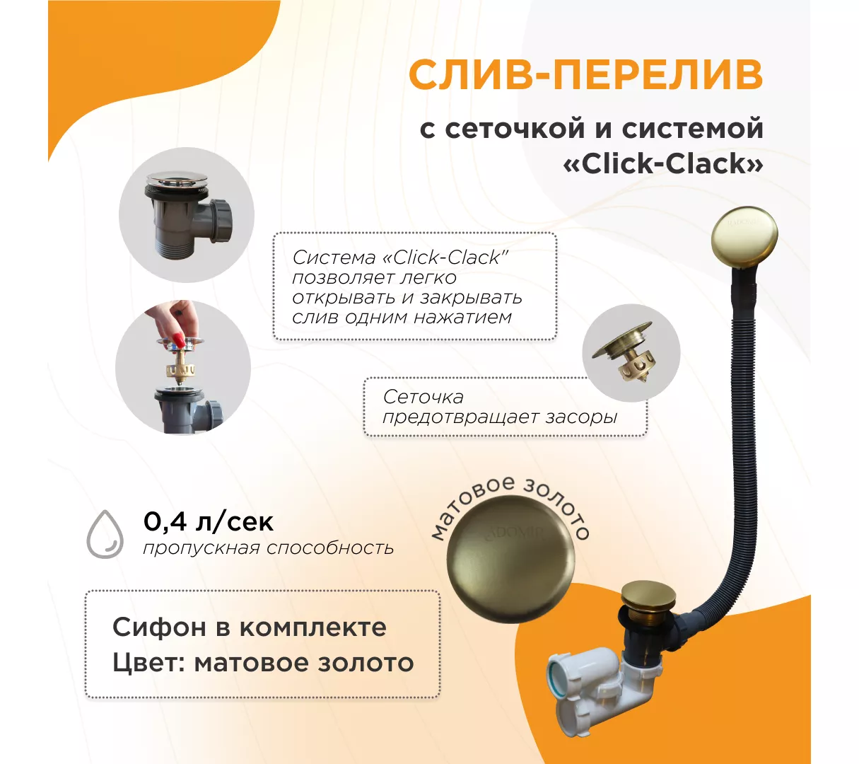 Слив-перелив с сеточкой и системой «Click-Clack»— это современное и функциональное решение для ванной комнаты. Сеточка слива защищает канализацию от засоров.