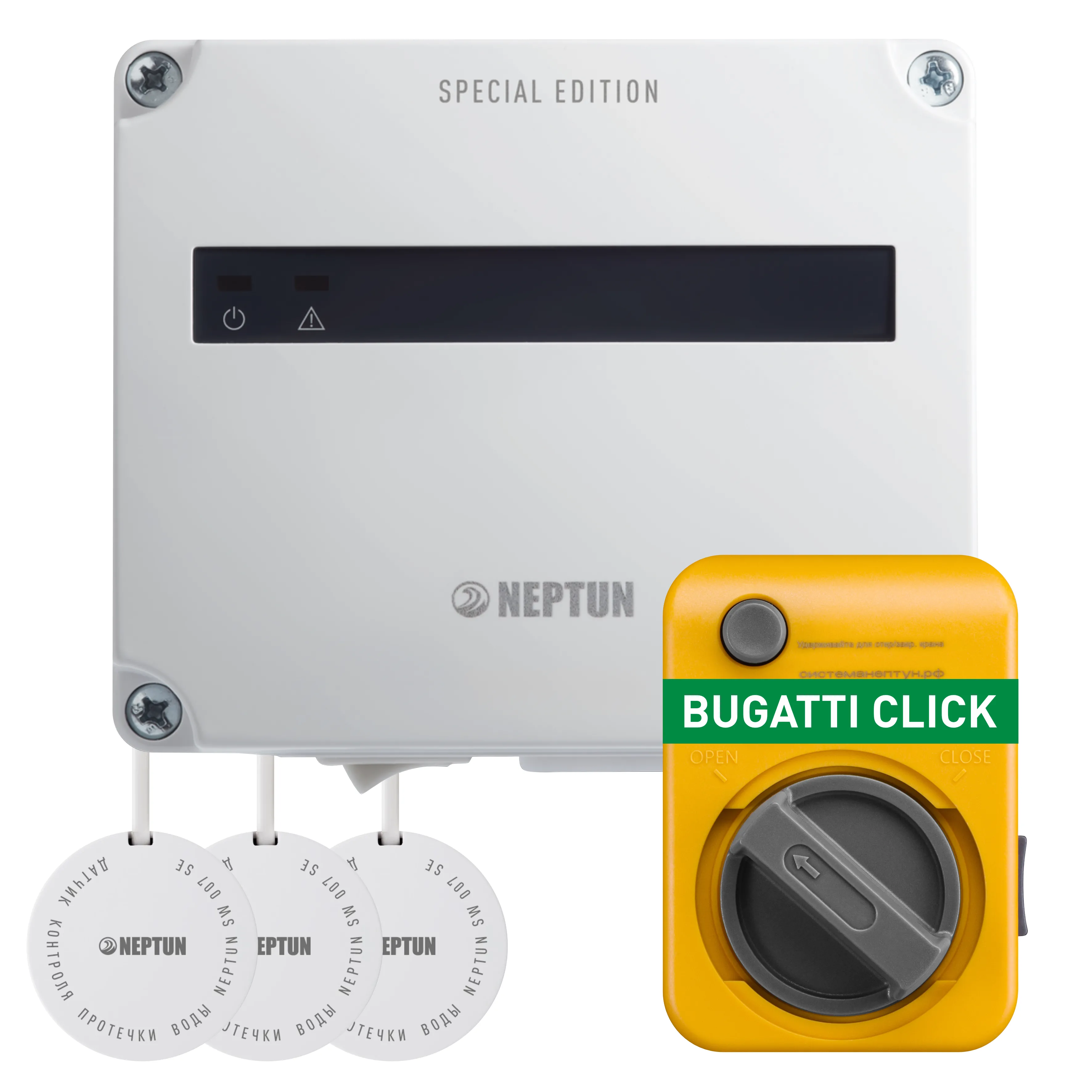 Комплект защиты от протечки воды NEPTUN BUGATTI Click SE Базовый (1 кран) предназначен для обнаружения и локализации протечек воды и установки в квартиры с газовой колонкой, где подведено только холодное водоснабжение (в комплекте один кран) . Данный комплект построен на основе модуля управления Neptun Base - это простое, но при этом очень надежное устройство. Дополнительных функций не много, но если они Вам и не нужны, то это идеальное решение.