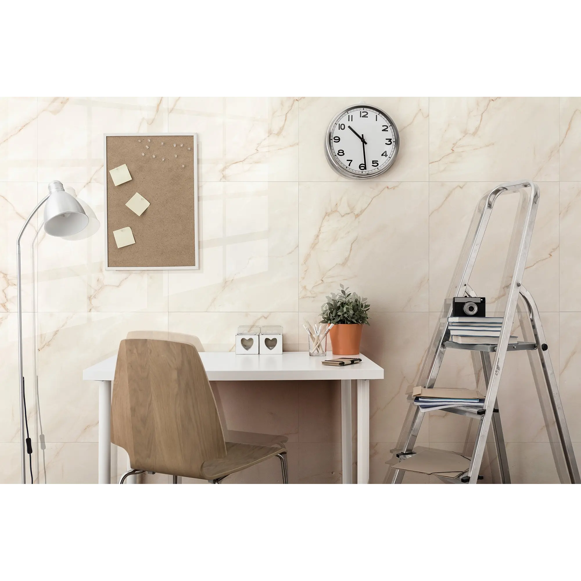 Теплая и уютная коллекция керамогранита Chillout с имитацией бежевого мрамора – это воплощение домашнего комфорта. Нежный фон разбавляют тонкие золотисто - коричневые прожилки с характерным диагональным уклоном, которые при облицовке складываются в рисунок, схожий с натуральным слэбом. Отполированная до зеркального блеска поверхность многократно отражает любой источник света, что усиливает впечатление. Нейтральный цвет позволяет использовать в отделке богатую палитру оттенков и материалы с различной фактурой.