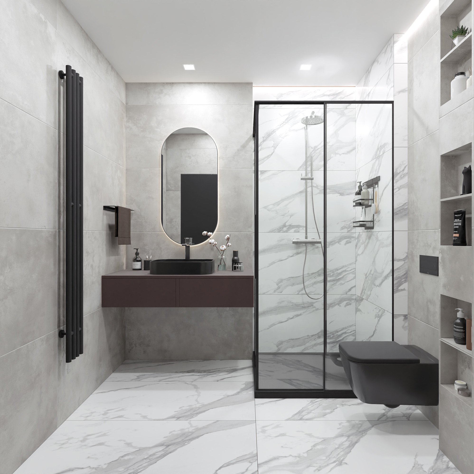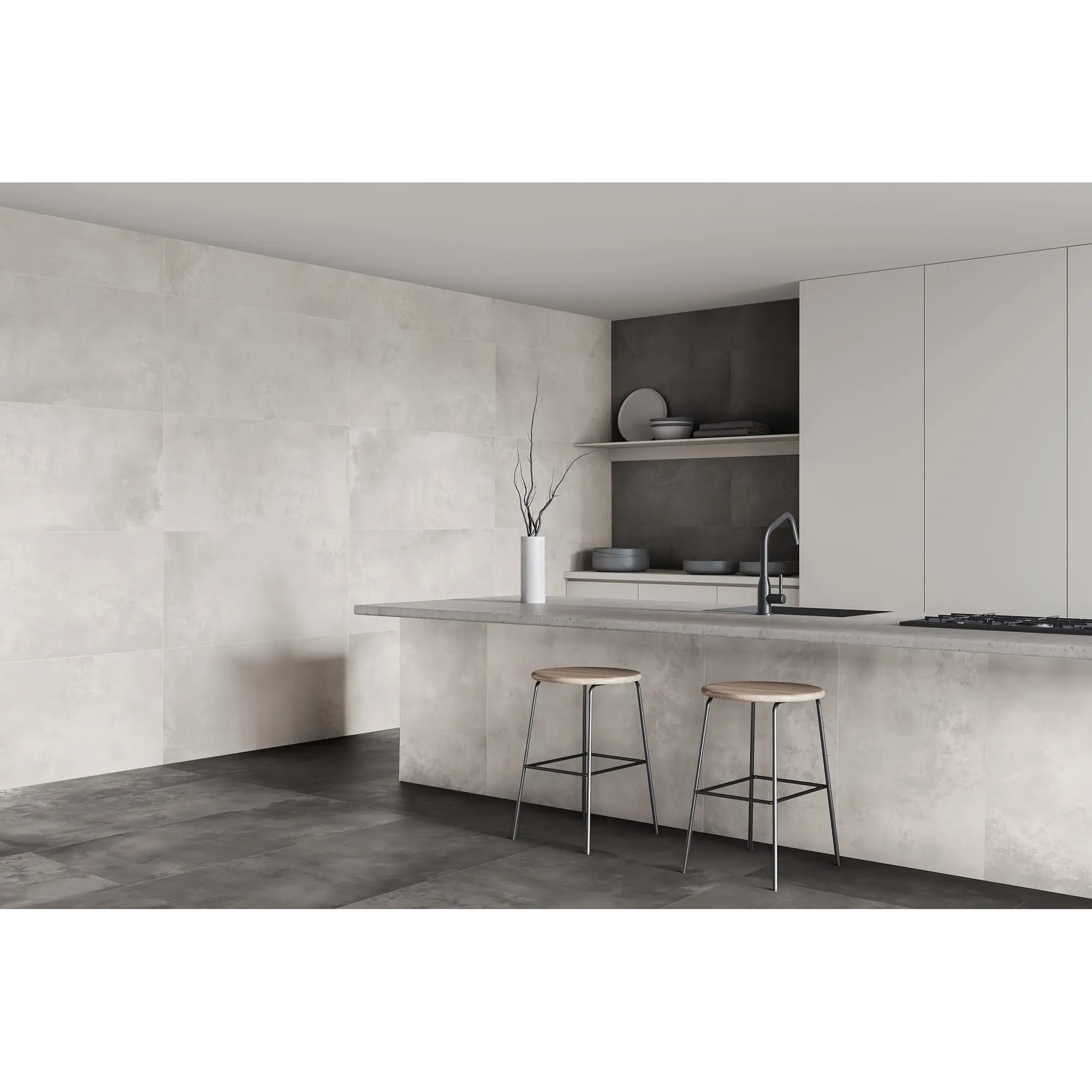 Атмосферная коллекция керамогранита для ванной и кухни Vibe – это реалистичная имитация декоративной штукатурки, выполненная в четырех роскошных оттенках серого: от жемчужного до почти черного. Это идеальный выбор для создания оригинального интерьера в любом современном стиле – от сканди до лофта, от хай-тека до брутализма. Плиты гармонично сочетаются, что позволяет использовать их комбинацию как в качестве базы, так и для зонирования отдельных областей. Муаровая фактура с характерными переходами цвета выглядит свежо и ярко, привлекая внимание и не надоедая.