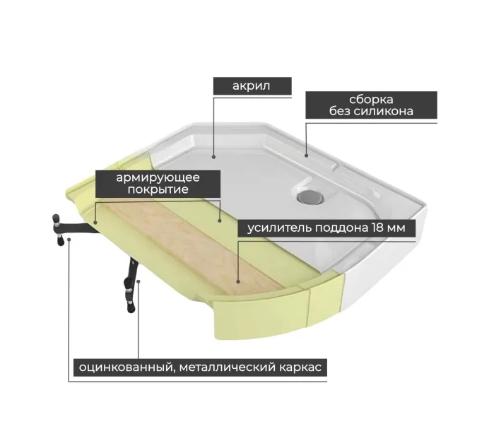 Сборка без силикона (увеличивает срок службы), внутренняя сборка (облегчает установку и ревизию, позволяет установить душевую кабину в ограниченном пространстве),смеситель резьбовой (без хомутов), съемный экран поддона (позволяет осуществлять ревизию сифона), цвет профиля матовый хром.