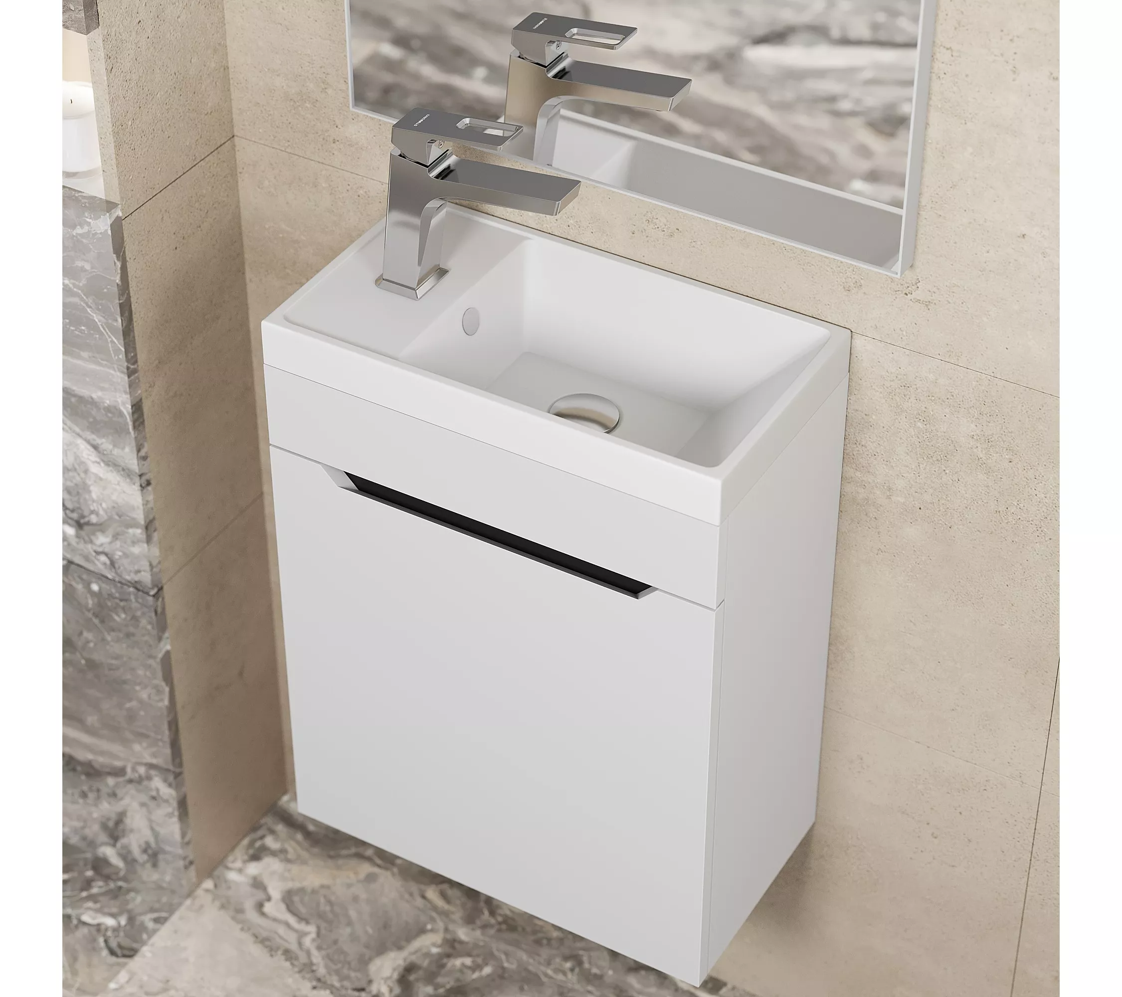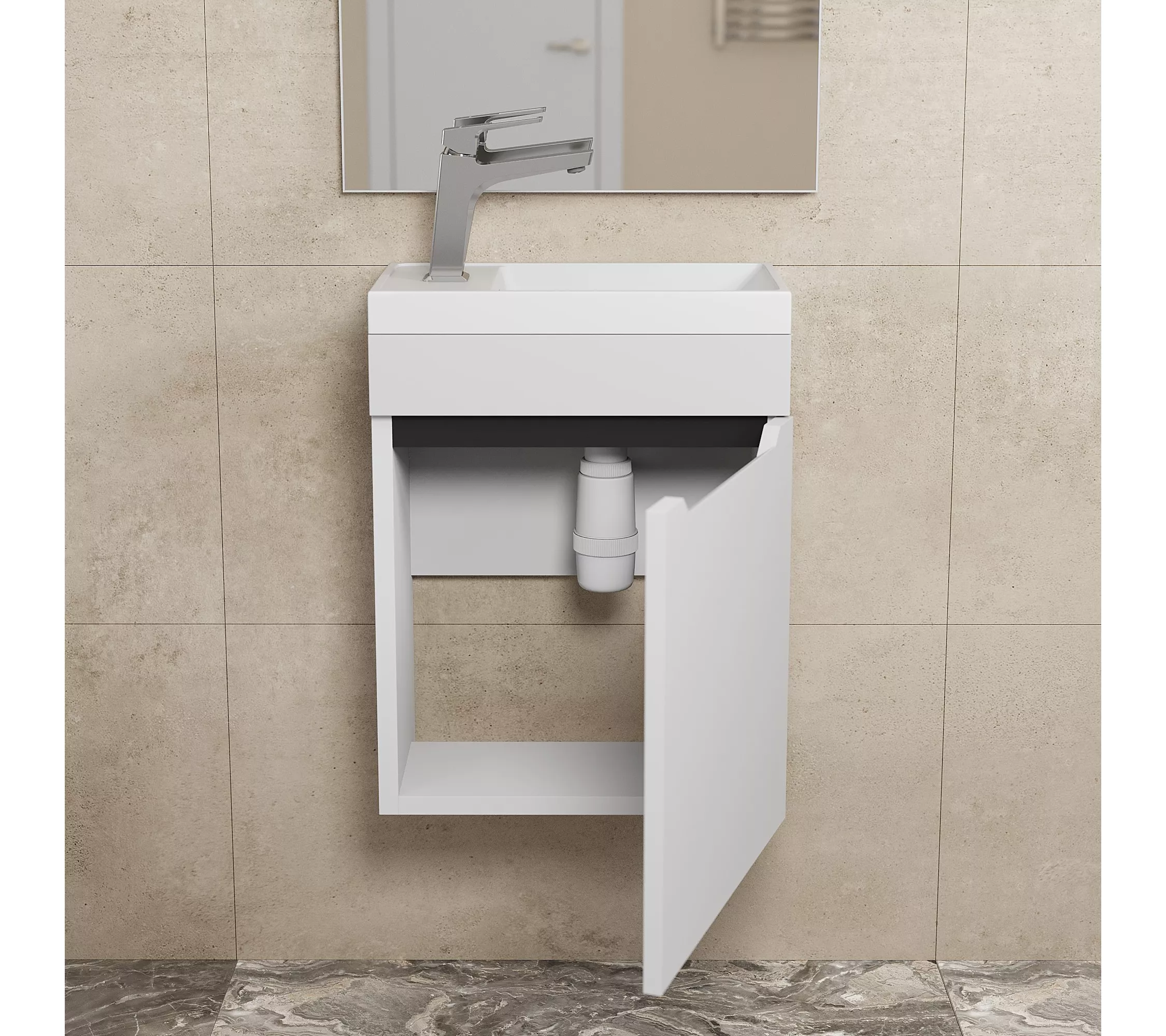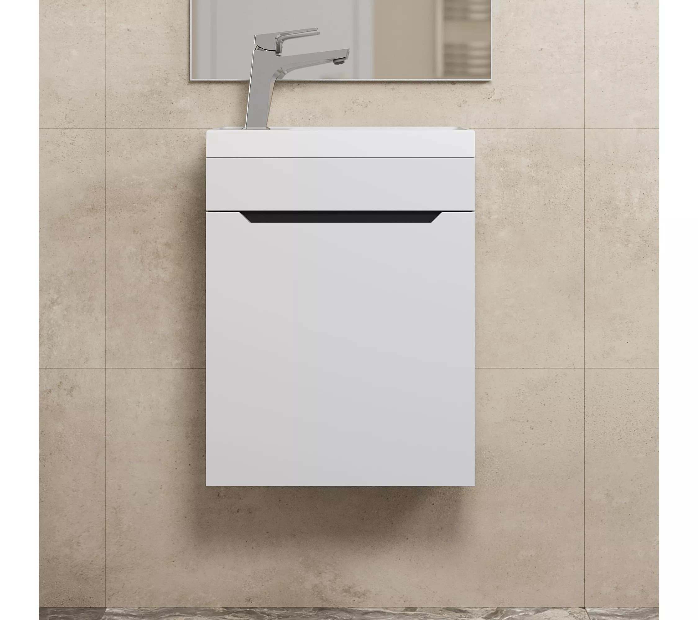 Элегантный минималистичный дизайн тумбы дополняет ее безупречная матовая поверхность.